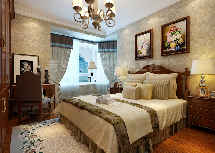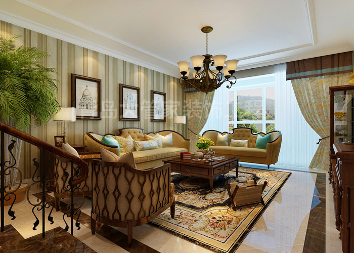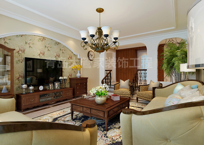 此案例追求风格统一的基础上,划分空间格局,采用美式装修元素勾勒风格特点。家具采用全部实木材质彰显